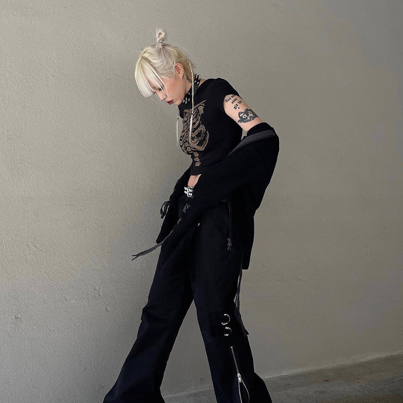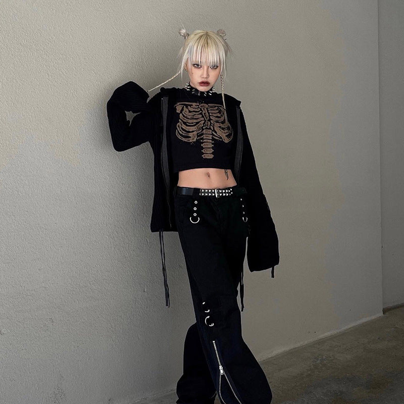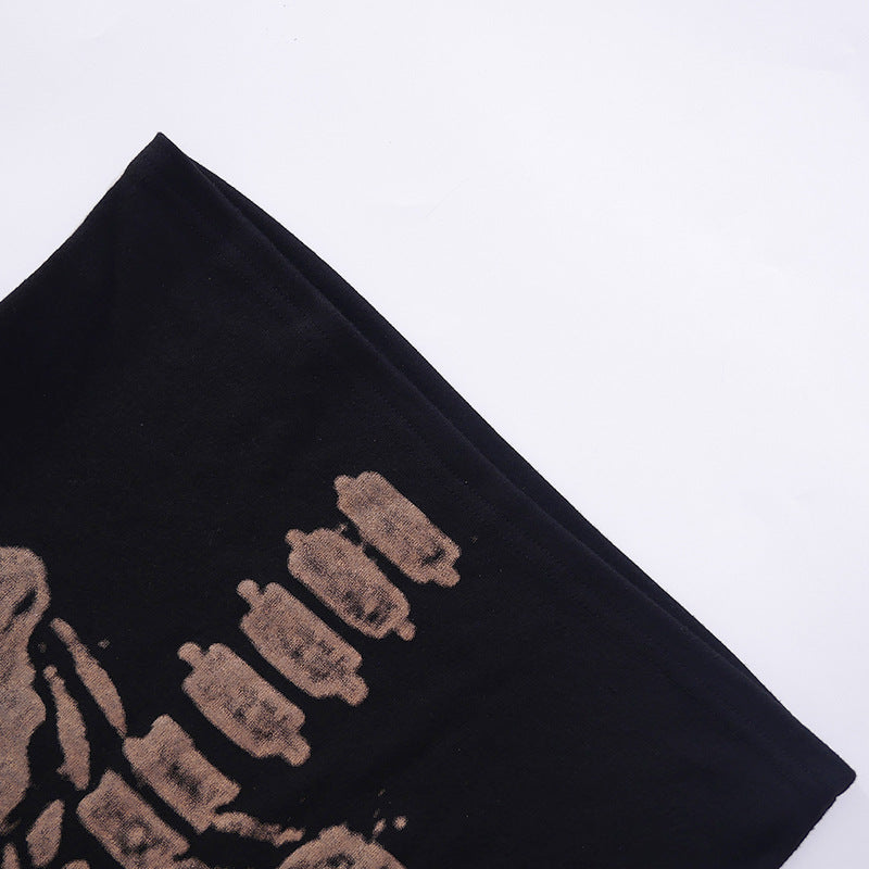Retro Dark Round Neck Skeleton Print Ladies Top